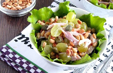 Копченая курочка, жареные кедровые орешки, сладость винограда отлично сочетаются в этом салате.Для его приготовления понадобится копченый куриный окорочок или окорочок-гриль и желательно зеленый виноград без косточек.