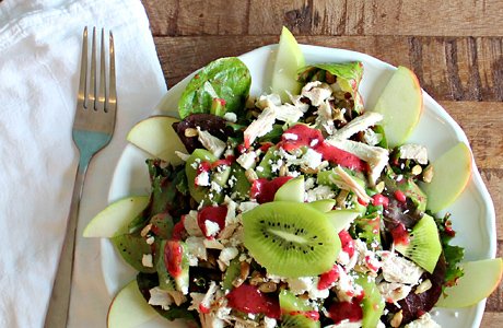 Этот салат часто встречается под названием «Оригинальный». Интересное сочение мяса, киви и зеленого салата дополнено кисло-сладким горчично-апельсиновым соусом. Салат получается очень вкусным, пикантным, свежим.