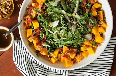 В тарелку выложить ломтики тыквы, бекон и семечки. Слегка перемешать. Украсить рукколой. Сбрызнуть оливковым маслом. Приятного аппетита!
